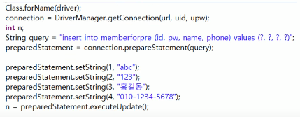 (statement과의 차이점은 아래의 파란색글자와 같이 쿼리문을 먼저 작성하고, 나중에 각 데이터를 set해줌)