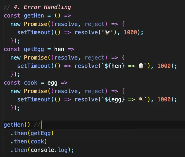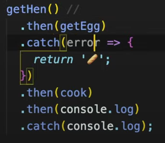 - .then의 프로미스는 프로미스를 리턴하므로, 그 프로미스의 .catch를 소환하는개념! "chaining"