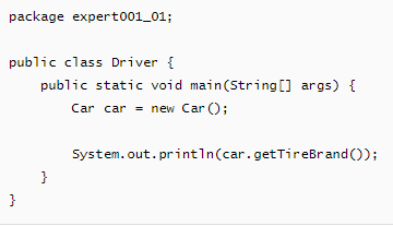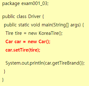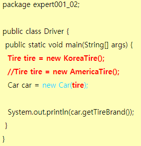 운전자가 차량을 생성시 타이어도 고른다. (이 경우 japan tire클래스를만들때 거기서 설정후, 바로 운전자클래스에서 japan tire를 추가해주기만 하면사용가능) new Car생성시 생성자파라미터를 쓰고싶으면, Car클래스에서 생성자 작성 |