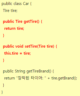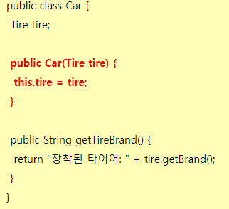 | 유연성이 떨어지는코드, Car생성단계에서 tire의 정보를 모두 알아야함. |