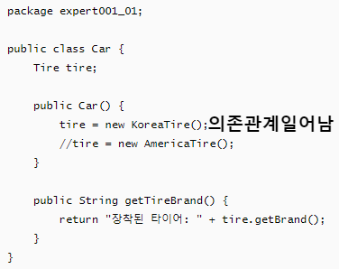 - Tire인터페이스에 한국, 미국Tire클래스를 만들고, Car클래스에서 의존관계 확인(의존되면서 타 클래스와 엮임)