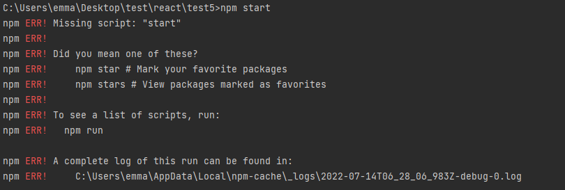 npm ERR! C:\Users\emma\AppData\Local\npm-cache\_logs\2022-07-14T06_28_06_983Z-debug-0.log