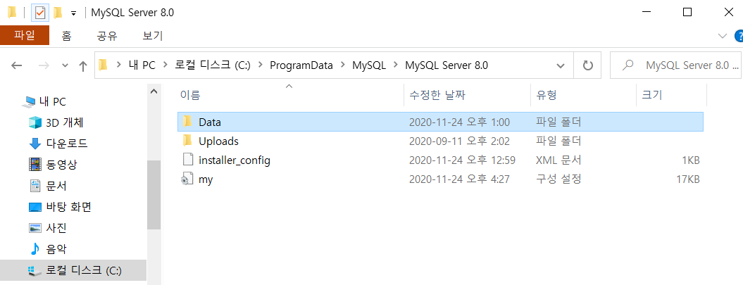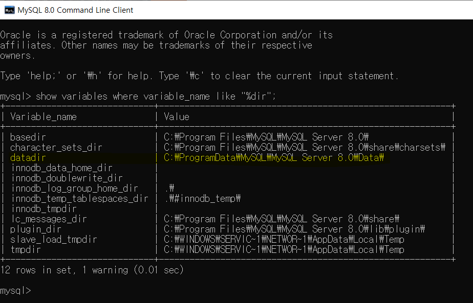 | 1. mysql 8.0 command line client를 켜고 2. 오른쪽의 코드를 작성 코드 : SHOW VARIABLES WHERE Variable_Name LIKE "%dir"; 3. 아래 커맨드창에 노란색 value값에 나온경로를 복사하여 검색하면 해당파일이 나온다. (참고 : 경로를 복사하지않고 하나하나 찾아들어가는건 안됨. ProgramData파일이 눈에 안보이기때문) |