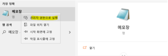 ★ 만약 저장했을때 수정권한이 없어서 수정안된다는 팝업이 뜨는경우는 아래와 같이 실행 ☞ 메모장을 관리자권한으로 연다 ☞ my파일을 따로 바탕화면에 복사한다음, 그 파일을 불러와서 고치고 저장