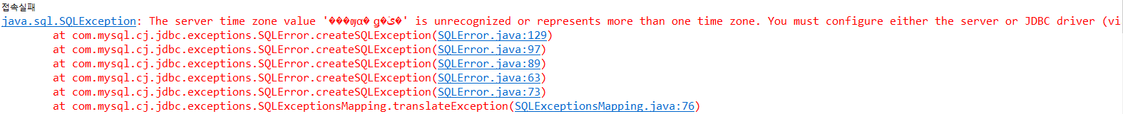 => mysql-connector-java버전 5.1이후의 버전은 KST타임존을 인식못하기 때문에 뜨는오류