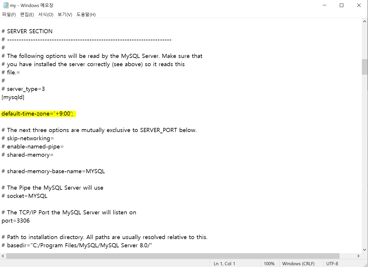 (추가위치는 [mysqld]아래, 스크롤 위치 참고)