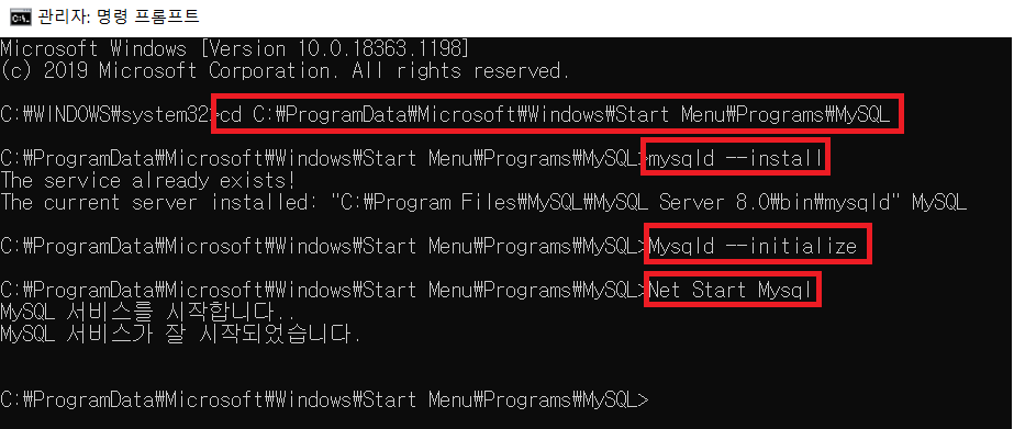 - 코드 : mysqld --install => 저는 아래와같이 이미 존재한다고(already exists!)나오지만, 아마 Service successfully installed라고 뜨실거임