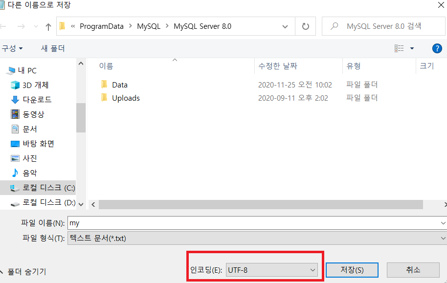 JDBC-DB연결을 위해 my.ini파일을 수정한경우, 기본인코딩은 UTF-8로 되어있다.