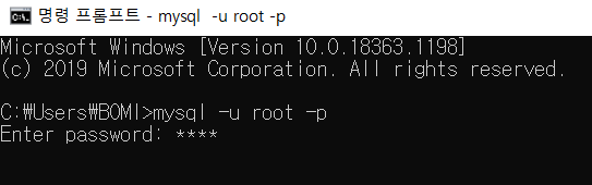 (저는 데이터베이스 ID가 root였으므로 mysql -u root -p치고 엔터후 비번치기!)