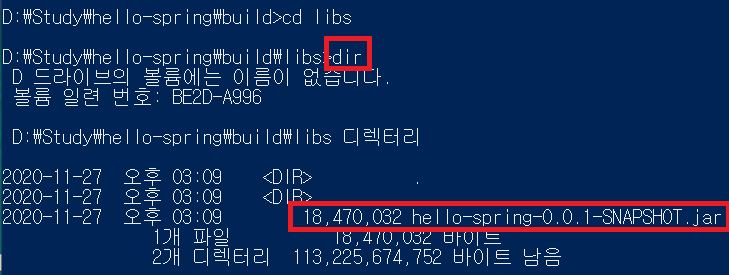 4. dir로 현재 파일 조회해보면 약 18메가정도하는 jar파일이 생성된것을 볼 수 있다