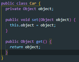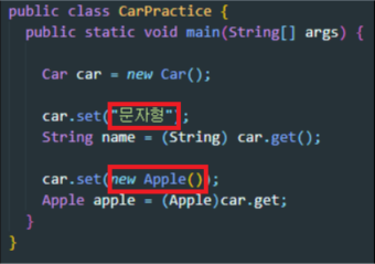| - car클래스의 멤버변수 object는 타입이 Object형(최상위 클래스, 그래서 모든타입을 다 저장가능) - 그래서 main클래스에 String타입도 object타입도 모두 담을 수 있지만, 꺼낼때 형변환을 해줘야한다. (한 클래스에서 사용할 타입을 지네릭스로 지정해두는게 효율적이다, 무턱대고 object사용은 곤란함) |