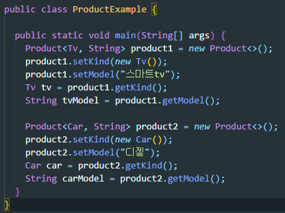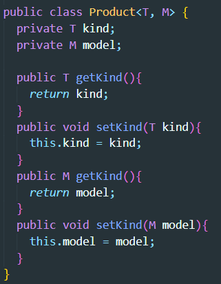| Product클래스에는 두가지타입의 변수를 담을 수 있다 | 2가지 변수에 각각 값을 지정하고 가져올때, 그 타입에 맞게 지정하고 가져와야한다. |