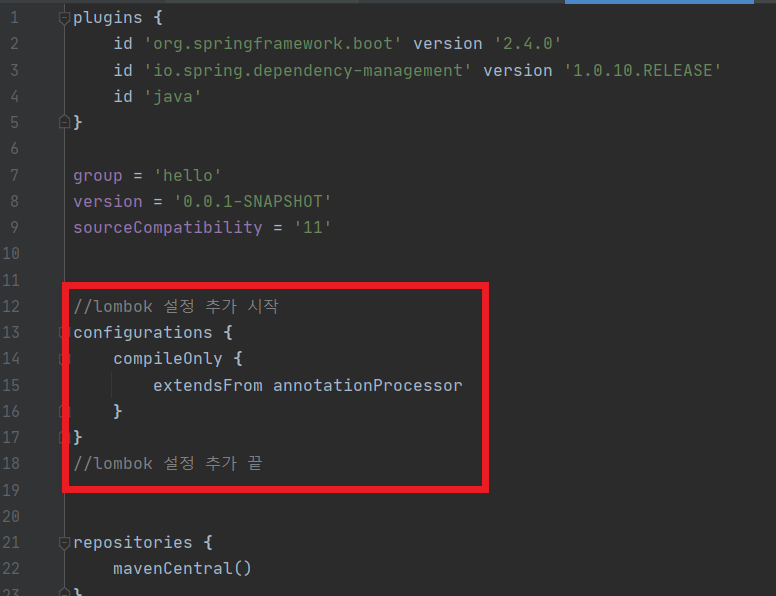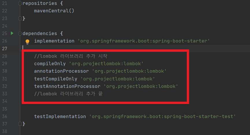 3. 같은페이지 아랫쪽에 dependencies안에 lombok라이브러리 추가