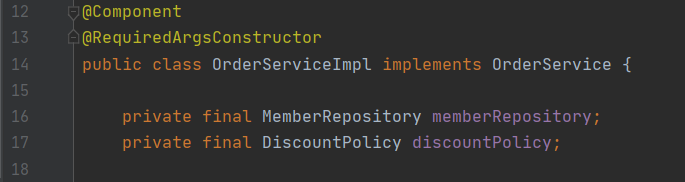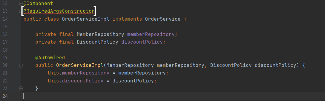 생성자 주입하려는 클래스에 @RequiredArgsConstructor를 추가하면 윗부분에 Lombok라이브러리가 추가된다.