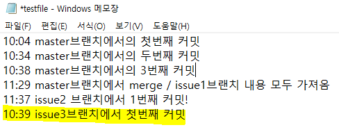 issue3브랜치에서 위와같이 내용추가 후 커밋해줌. 현재 브랜치의 위치는 issue3