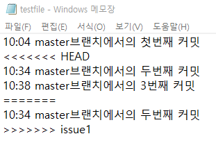 해당 파일을 열어보니 현재브랜치(HEAD)와 issue1브랜치의 내용이 다르기때문에