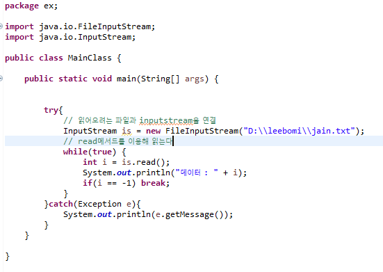 - read()메서드를 이용해서 데이터를 가져온다(1byte씩, 느리다, 더이상불러올게없으면 -1반환)