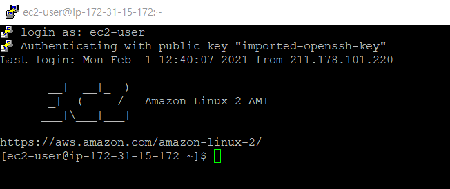 4. login as : ec2-user로 접속하면 아래와 같이 Amazon Linux 2 AMI라고 뜬다! 그럼 AWS와 연결된것!